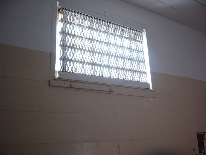 blacks jumpsuits standing on a red line, and being yelled at by some warden.